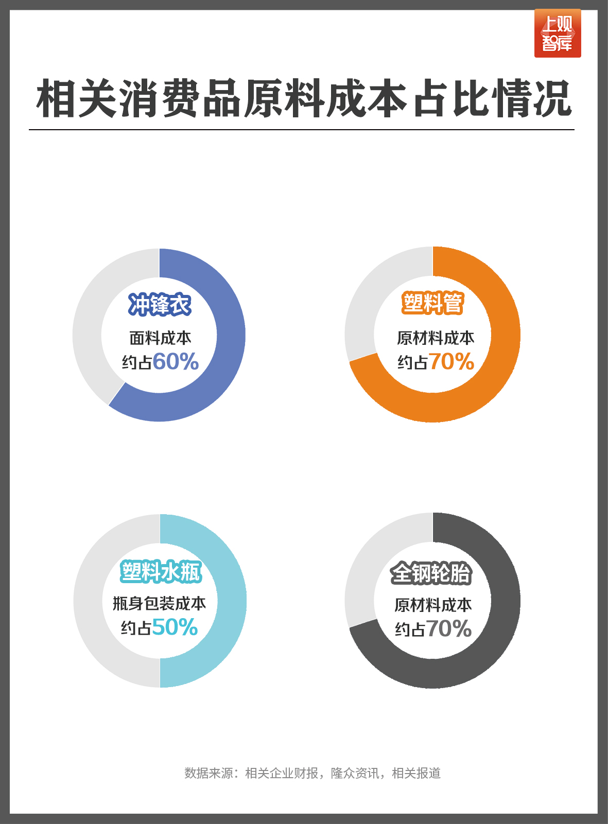 超市售卖的各种瓶装饮料瓶,其原料则是塑料。上观智库解读某矿泉水饮料品牌的财报发现,瓶身与包装约占总成本的50%,而瓶身与包装成本中,PET(聚酯)又占到了50%。也就难怪,印度瓶装水龙头Bisleri近期已将产品价格上调了11%。